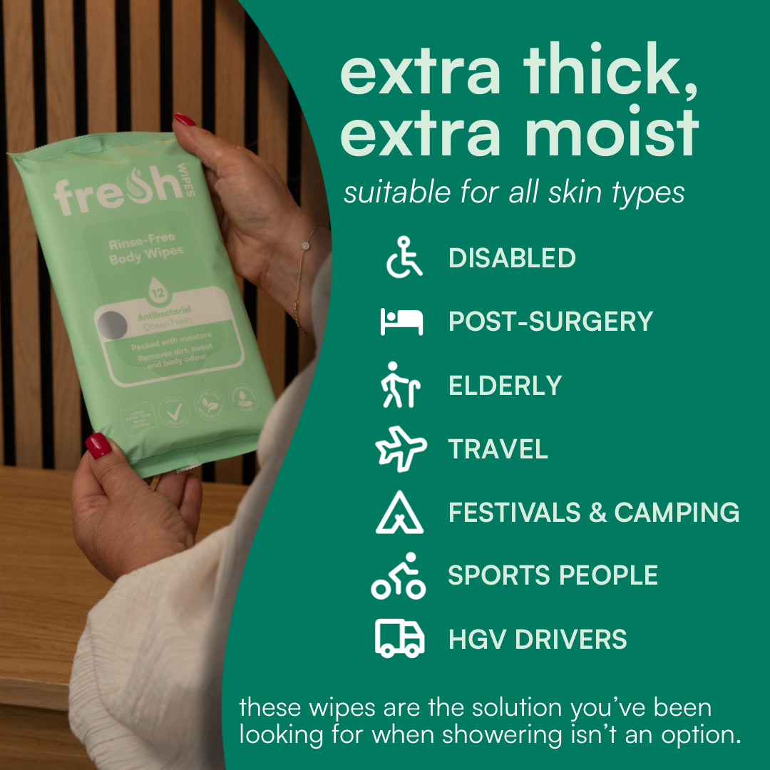 Each pack contains 12 large, extra-wet wipes designed for full-body cleansing.