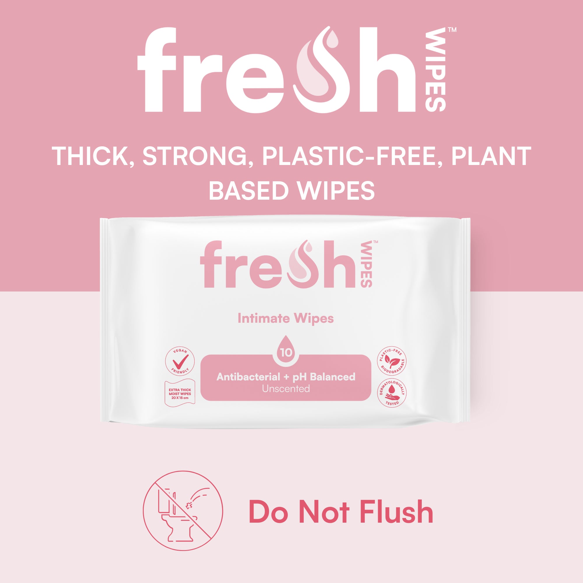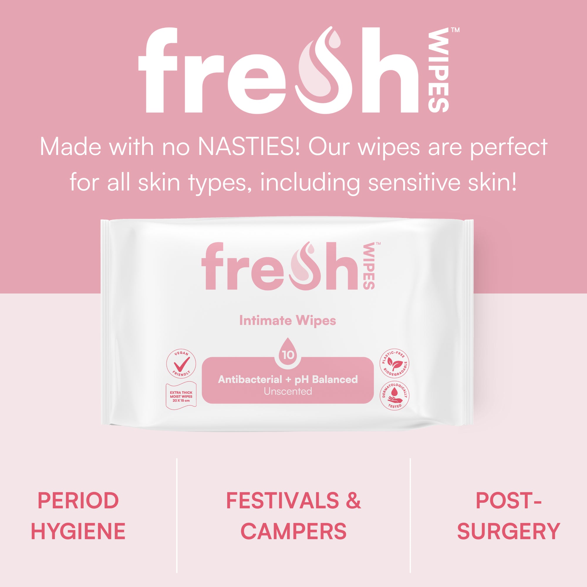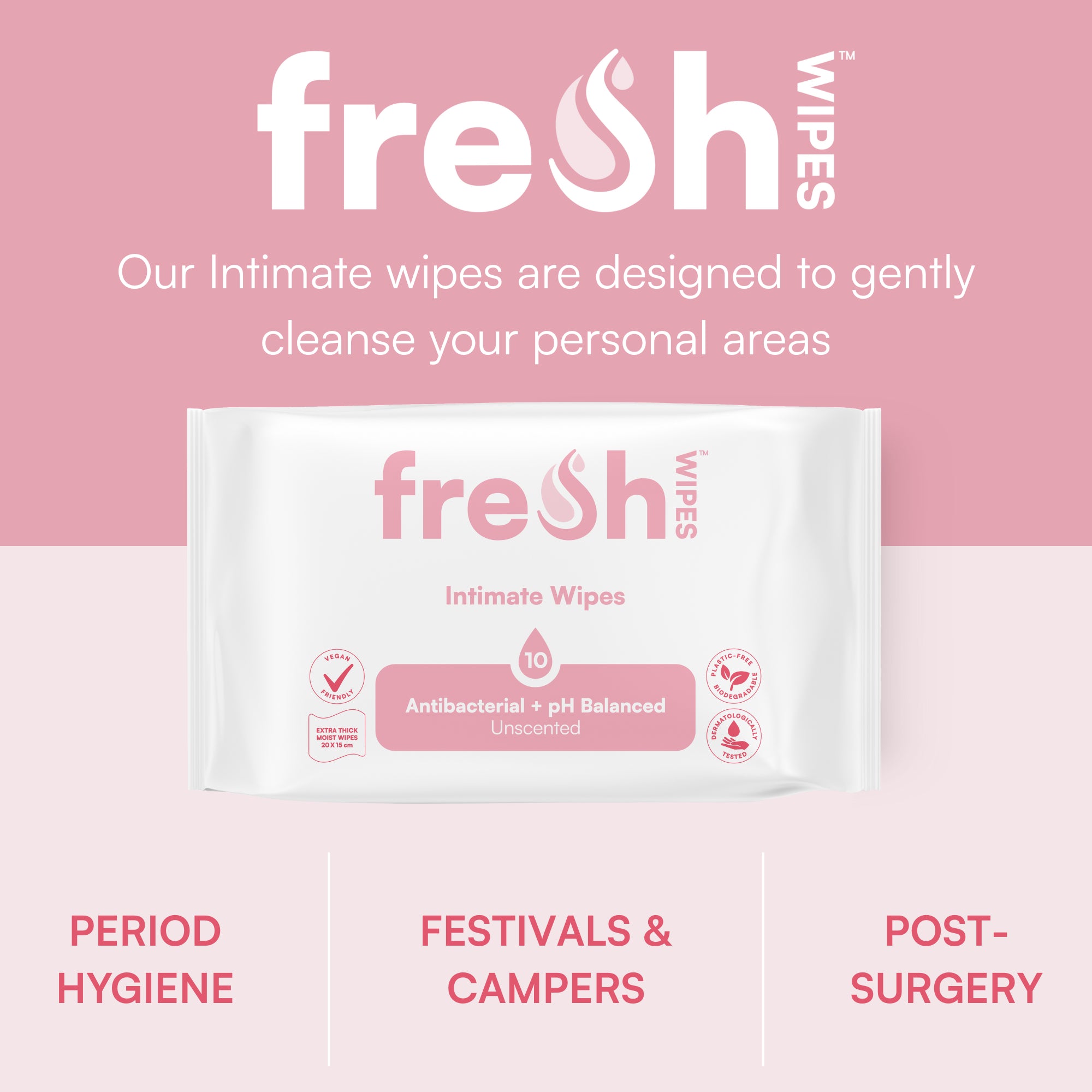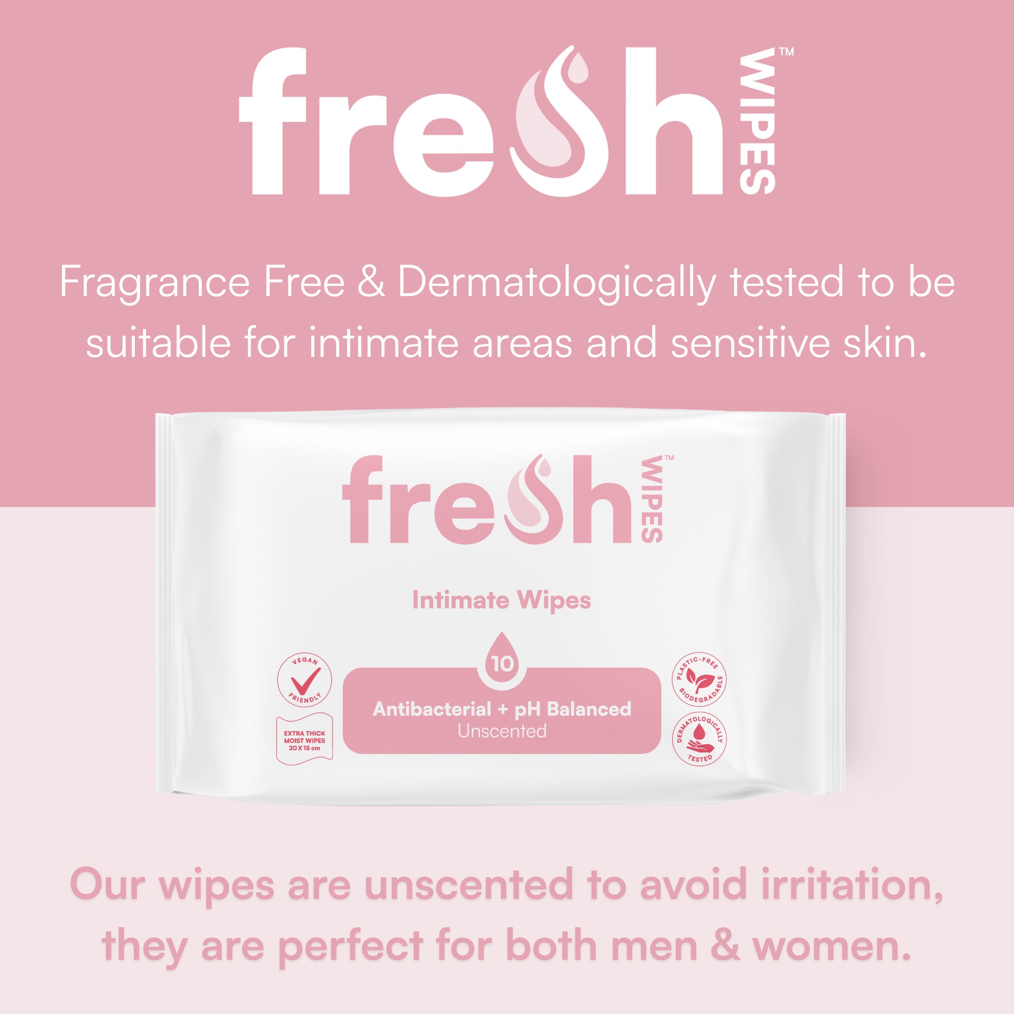Welcome to FreshWipes Intimates, your ultimate solution for intimate hygiene. Our small, unscented wipes are specially designed for use in intimate areas and are gentle yet effective. At  20x15cm per wipe, each pack of FreshWipes Intimates comes with 10 wipes, making it easy to stay clean and fresh on-the-go.
