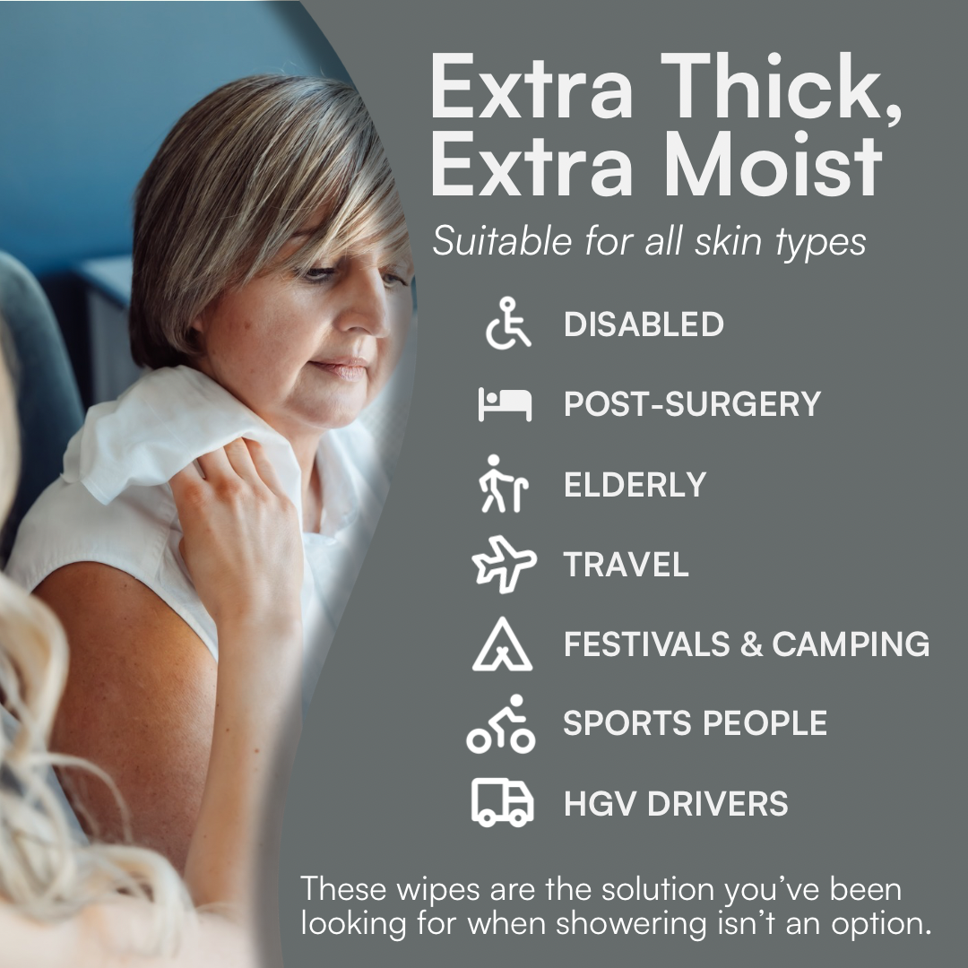 Our wipes are gentle, dermatologically tested, extra thick and full of moisture to ensure a thorough clean. Containing a gentle antibacterial agent (Chlorhexidine) to remove odour and leave you feeling fresh.