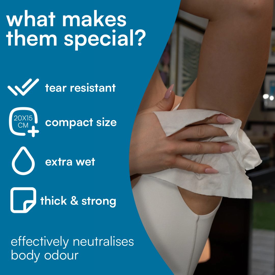 Heat, sweat, and tight clothing cause irritation and body odour. An antibacterial wipe keeps you clean, soothed, and protected – particularly when showering isn't possible.