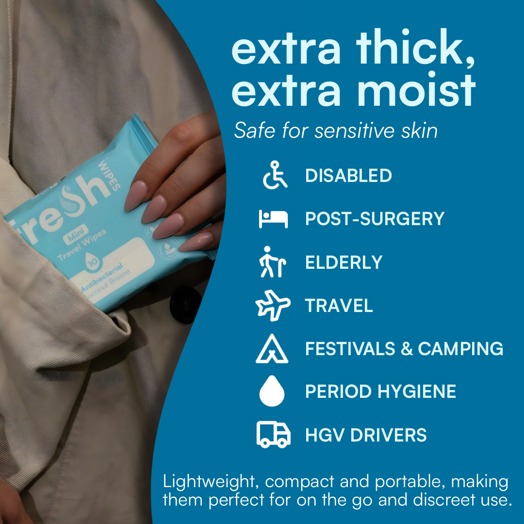 Half the size of our regular body wipes (20x15cm) and can easily in your pocket, handbag or rucksack.