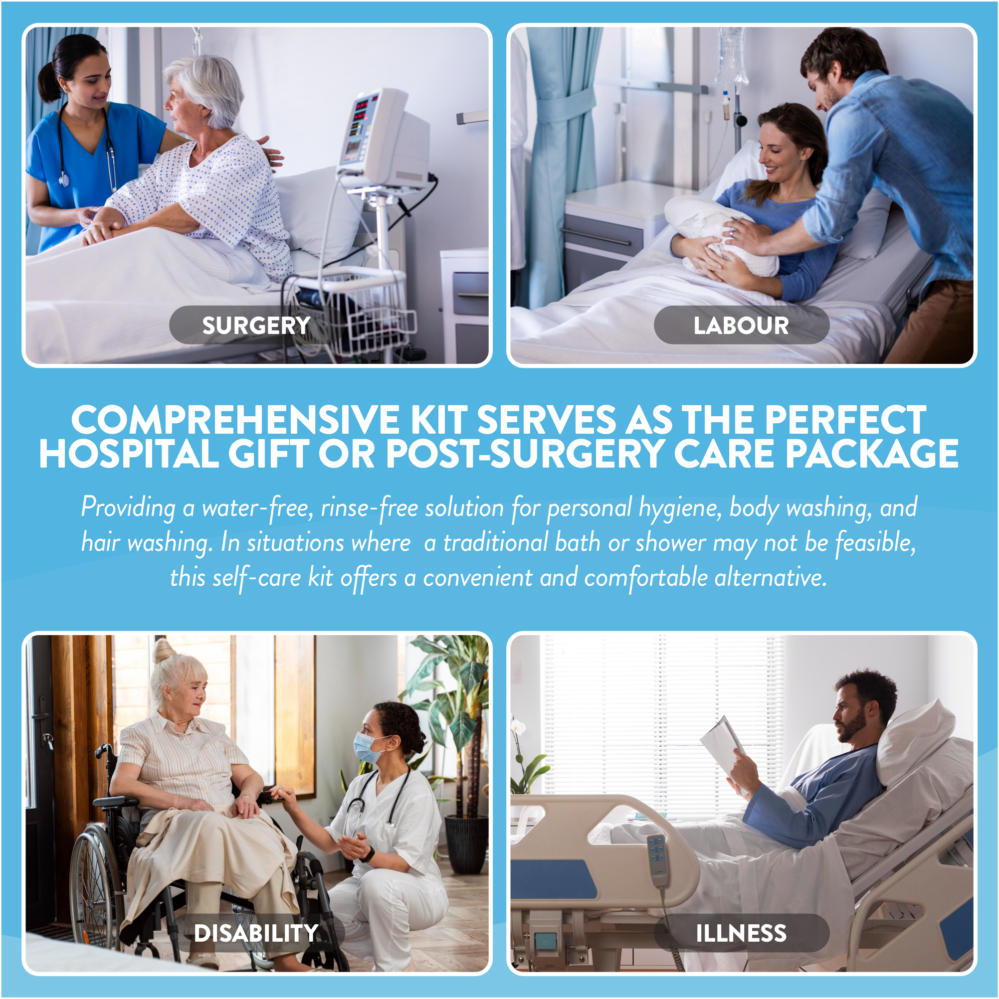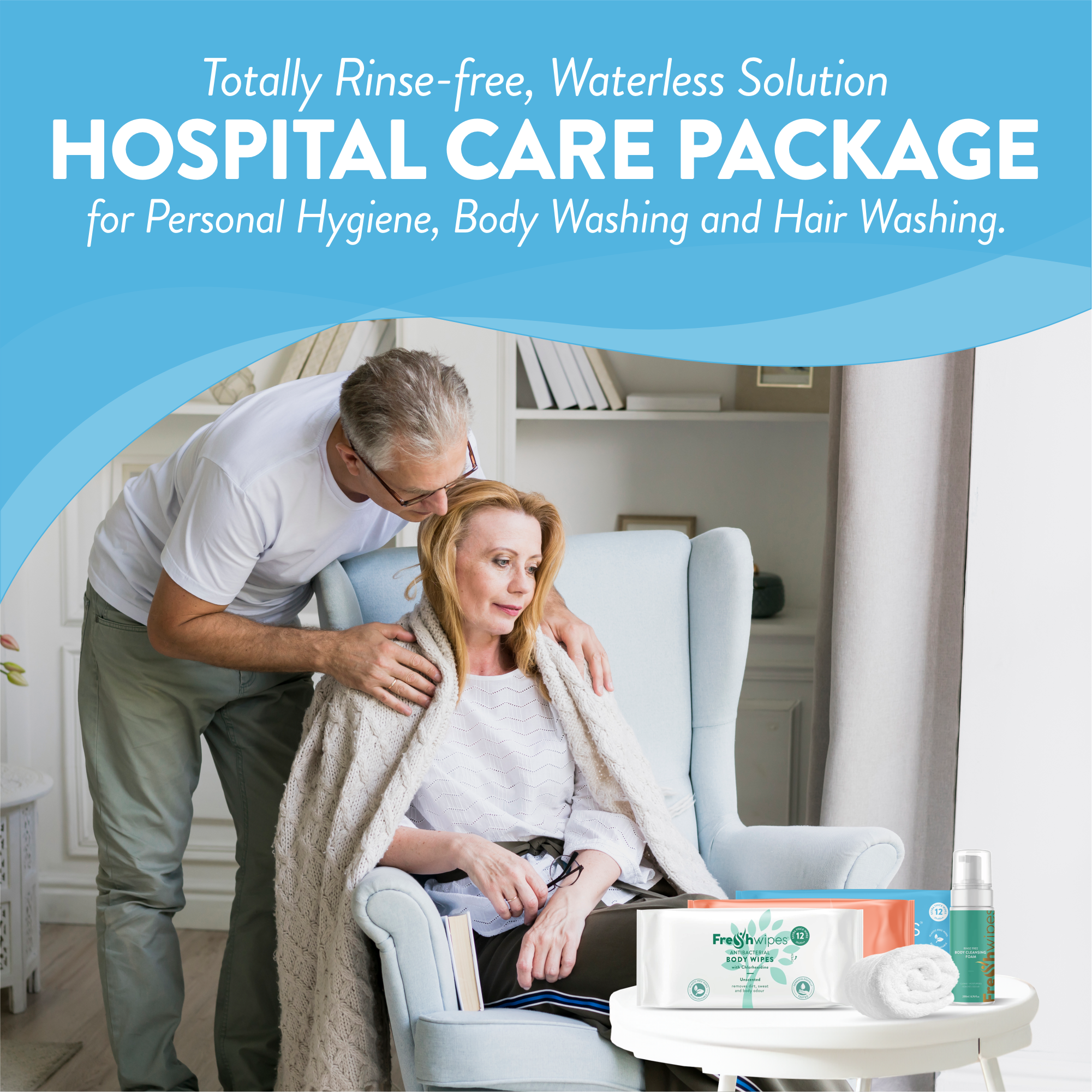 Our rinse-free body cleansing foam and ocean fresh shampoo caps are Chlorhexidine-free!
