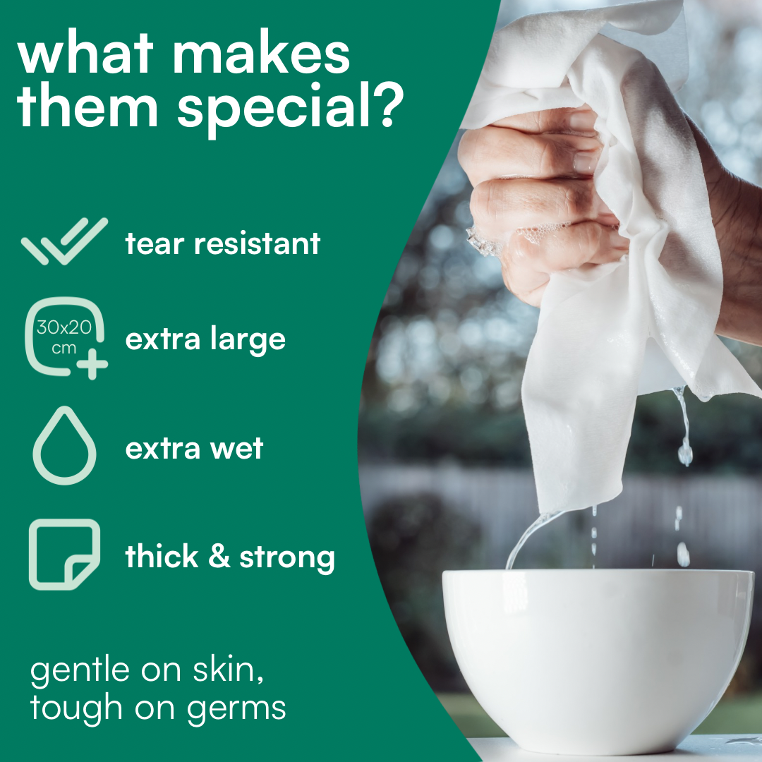 Adult sized, 30x20cm wipes - just one XL wipe cleans your whole body.