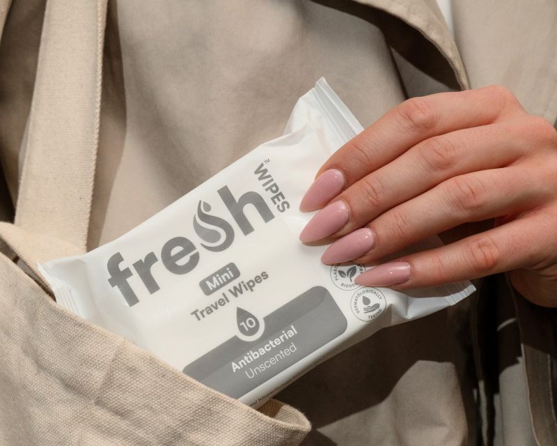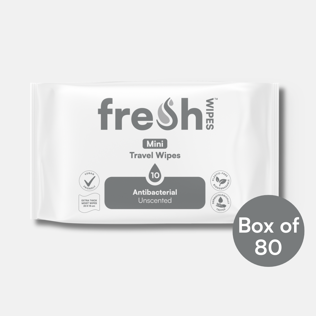 Mini travel wipes are compact, mini (20x15cm) body wipes designed for freshness on the go. They offer the same antibacterial, biodegradable benefits as our full-size wipes — just in a smaller, handbag- or pocket-friendly pack.