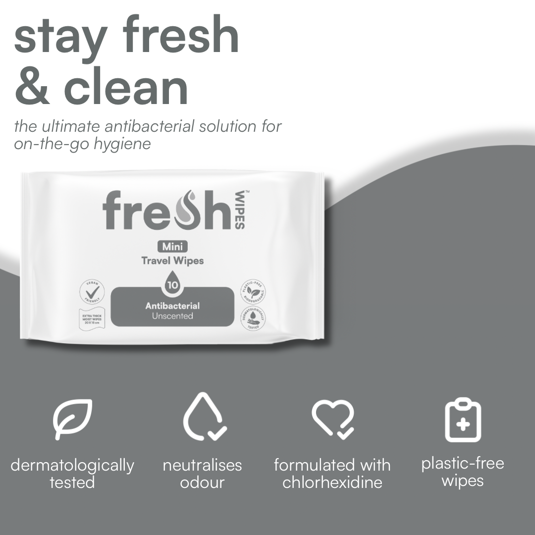 Each mini pack contains 10 thick, extra-wet wipes, ideal for travel, festivals, work bags, gym kits, school bags or glove